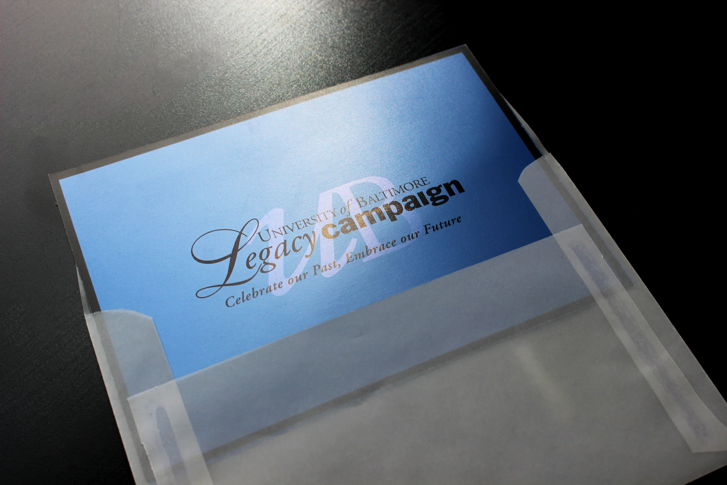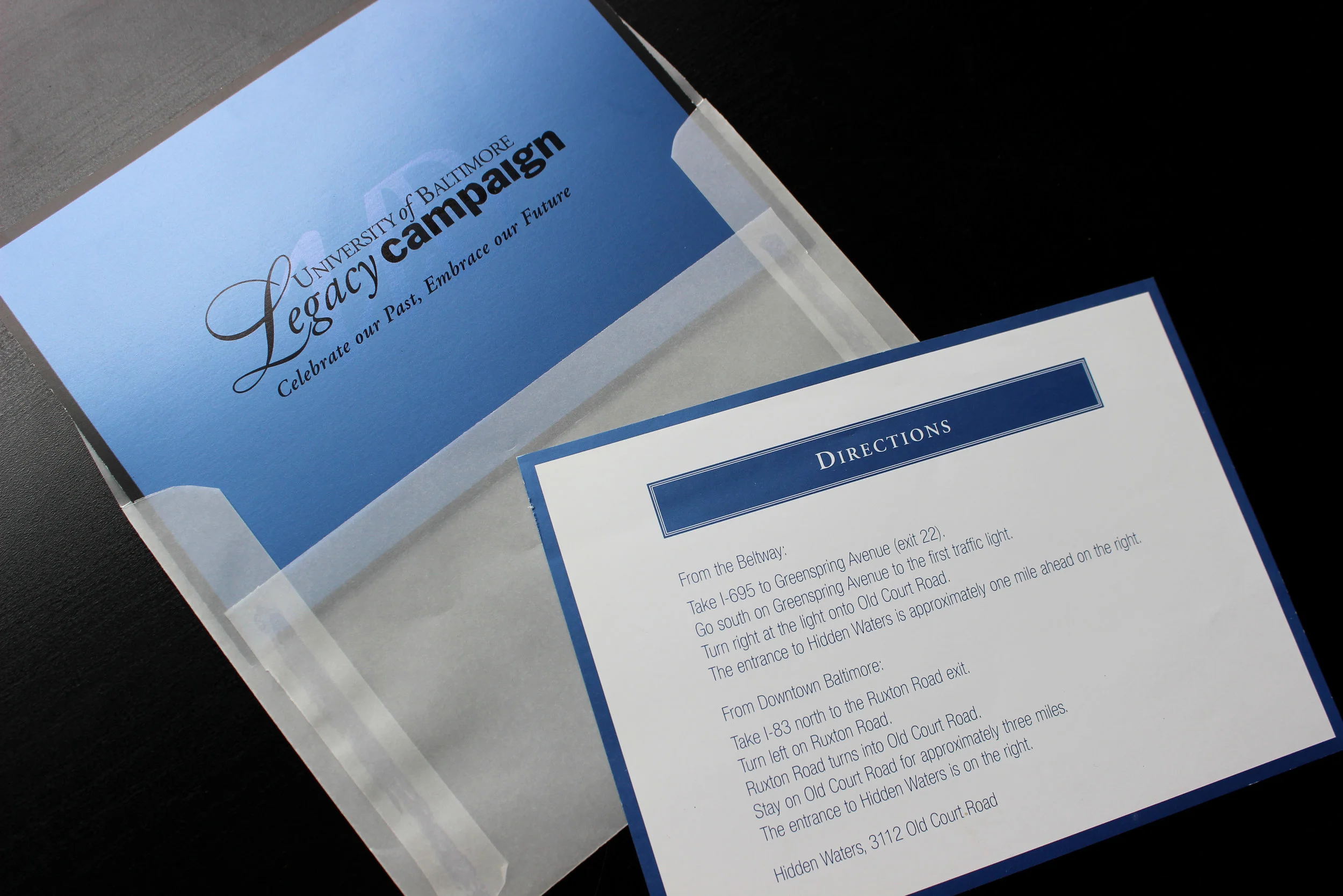This piece gives a flair of the majestic, while alluding to a timeless legacy through the use of metallic ink and varnish. Encased in a translucent envelope, the invitation included an event description, return card and directions.